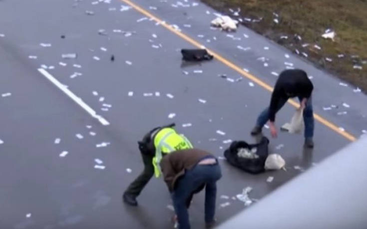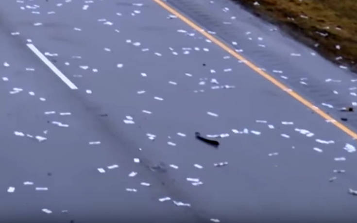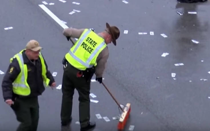 Εκατοντάδες χαρτονομίσματα των 5, 10 και 20 δολαρίων βρίσκονταν σκορπισμένα σε μία μεγάλη έκταση κατά μήκος του αυτοκινητόδρομου, καθώς το όχημα που τα μετέφερε, εξετράπη της πορείας του και συγκρούστηκε με ένα άλλο αυτοκίνητο που ήταν σταθμευμένο στην άκρη του δρόμου.