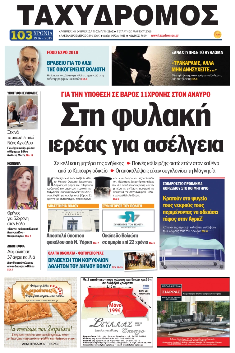 Το πρωτοσέλιδο της εφημερίδας «Ταχυδρόμος» του Βόλου