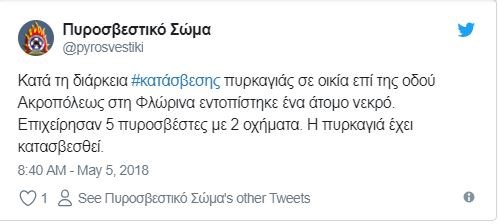 Ένας άνδρας έχασε τη ζωή του, έπειτα από φωτιά που ξέσπασε μέσα στο σπίτι του στη Φλώρινα και συγκεκριμένα επί της οδού Ακροπόλεως.