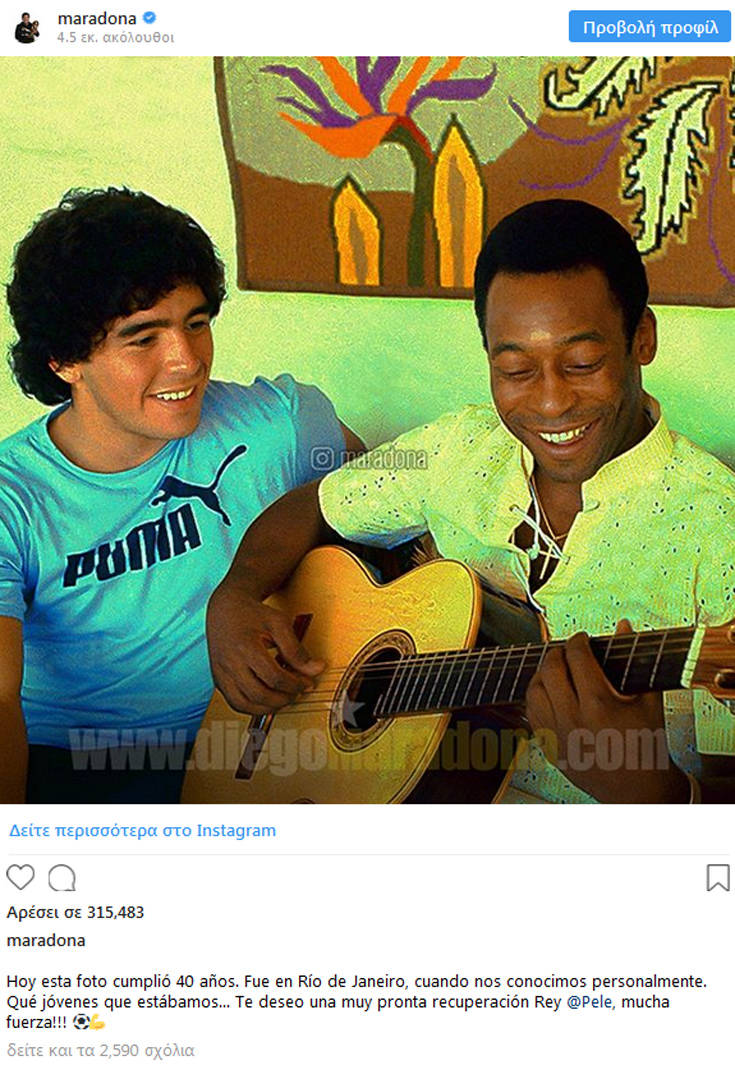 Οι δύο κορυφαίοι ποδοσφαιριστές όλων των εποχών σε μία υπέροχη συνύπαρξη ακριβώς πριν από 40 χρόνια. Ο νεαρός Ντιέγκο δίπλα στον Πελέ, ο οποίος παίζει κιθάρα. Και στην ανάρτηση τον αποκαλεί «βασιλιά»!